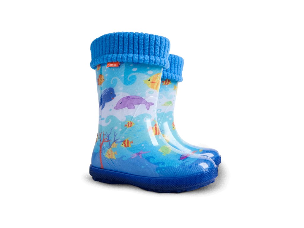 Dětské zateplené holínky demar HAWAI LUX EXCLUSIVE jsou ideální pro deštivé letní a podzimní počasí. Barva holínek je modrá doplněná o motiv rybiček stylově imitující podmořský svět. Mají hrubší protiskluzovou podrážku zajišťující bezpečnost chůze. Holínka je velice pohodlná a lehká. Materiál je vysoce kvalitní a odolné PVC podšité příjemnou textilií. Na patě obuvi je bezpečnostní reflexní pásek pro dobrou viditelnost dítěte ve tmě.