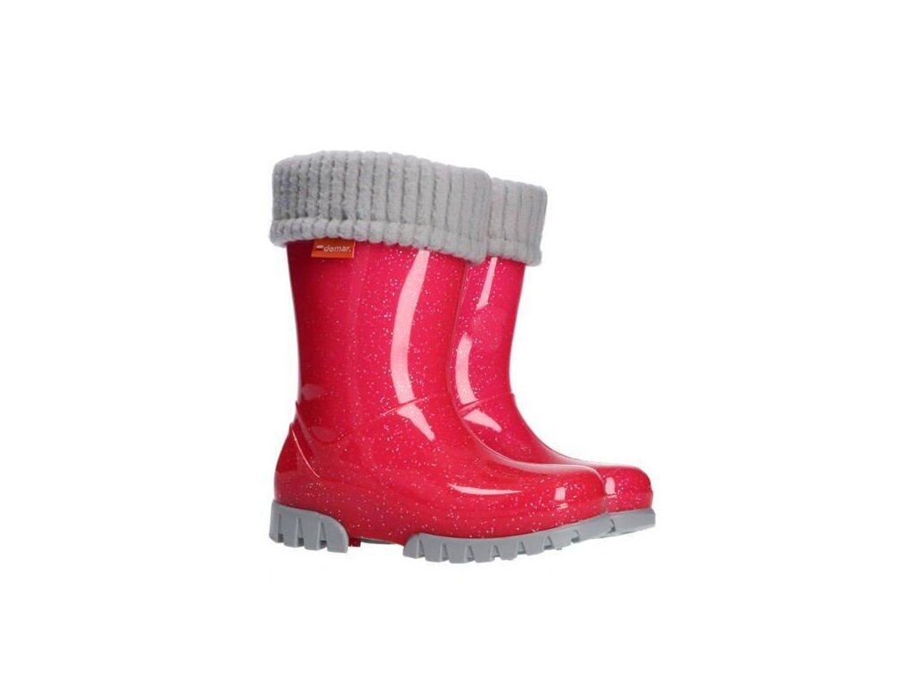 Dětské zateplené holínky demar TWISTER LUX jsou ideální pro deštivé letní a podzimní počasí. Barva holínek je růžová doplněna flitry. Mají hrubší protiskluzovou podrážku zajišťující bezpečnost chůze. Holínka je velice pohodlná a lehká. Materiál je vysoce kvalitní a odolné PVC podšité příjemnou textilií. Na patě obuvi je bezpečnostní reflexní pásek pro dobrou viditelnost dítěte ve tmě.