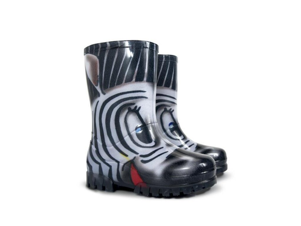 Dětské barevné holínky demar TWISTER PRINT jsou ideální pro deštivé letní počasí. Barva holínek je černobílá s motivem zebry. Mají hrubší protiskluzovou podrážku zajišťující bezpečnost chůze. Holínka je velice pohodlná a lehká. Materiál je vysoce kvalitní a odolné PVC podšité příjemnou textilií. Na patě obuvi je bezpečnostní reflexní pásek pro dobrou viditelnost dítěte ve tmě.