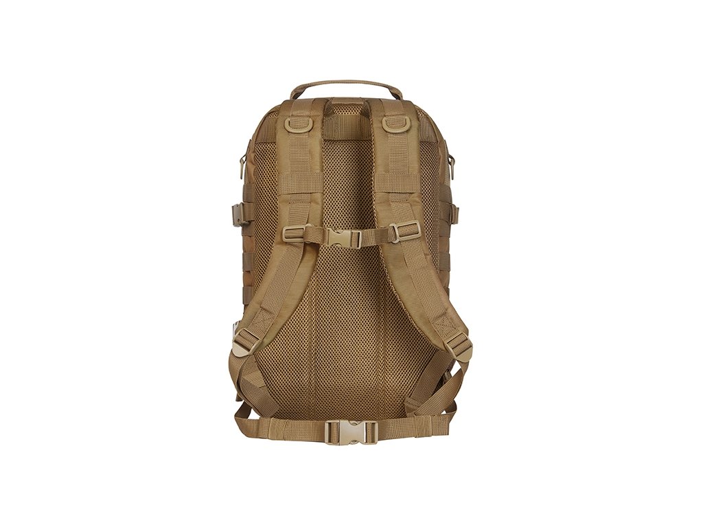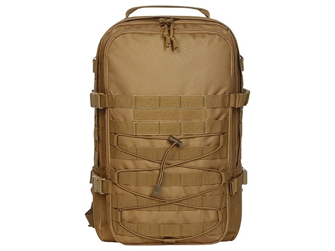 funkční batoh s třístranným popruhovým systémem Molle a lemováním na suchý zip, stahovací elastická šňůra, velká hlavní přihrádka se skrytým dvoucestným zipem, polstrovaná přihrádka na notebook s klopou na suchý zip, vývod na kabel nebo hadičku na pití, velká přihrádka ze síťoviny na zip, přední kapsa na zip s dvoucestným zipem a přihrádkami organizéru, boční kompresní popruhy s přezkami, které lze sepnout vpředu i vzadu, např. pro připevnění na na tyčoví kufru, D-kroužky na pravé a levé straně, polstrovaný zádový nosný systém s výškově nastavitelným hrudním popruhem; D-kroužky a poutka na podpěrách, odnímatelný, délkově nastavitelný bederní pás, madlo