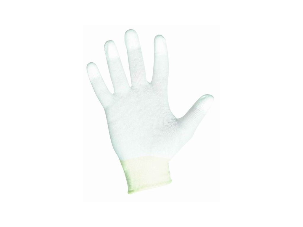 Bezošvý úplet z jemného bieleho nylonu,pružná manžeta, špičky prstov pokryté tenkou vrstvou bieleho polyuretánu.